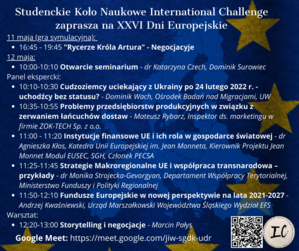 Serdecznie zapraszamy do udziału w tegorocznych XXVI Dniach Europejskich, które odbędą się 12.05.2022 r. w godz. 10.00 - 13.00. Dni Europejskie organizuje Studenckie Koło Naukowe International Challenge działające przy Katedrze Międzynarodowych Stosunków Ekonomicznych.