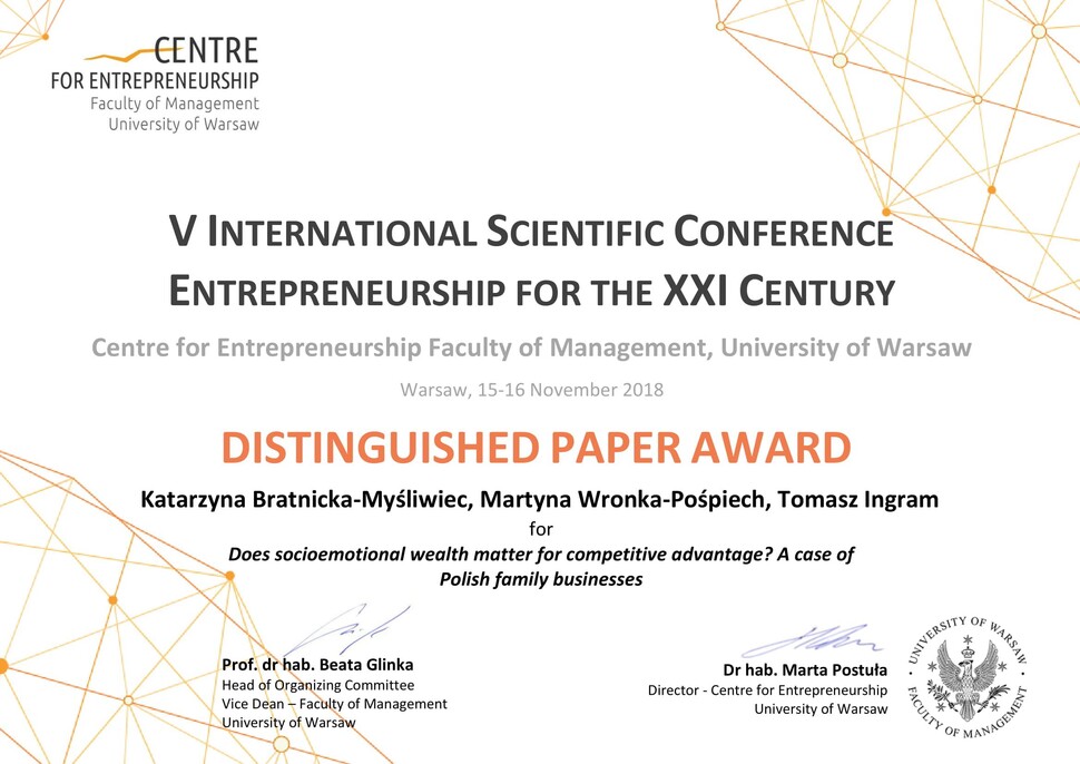 W trakcie konferencji dr Martyna Wronka-Pośpiech zaprezentowała artykuł „*Does Socioemotional Wealth matter for Competitive Advantage? A case of polish Family Businesses*” (współautorzy: dr hab. Katarzyna Bratnicka-Myśliwiec i dr hab. Tomasz Ingram). Artykuł ten został wyróżniony nagrodą „DISTINGUISHED PAPER AWARD” Autorom serdecznie gratulujemy!