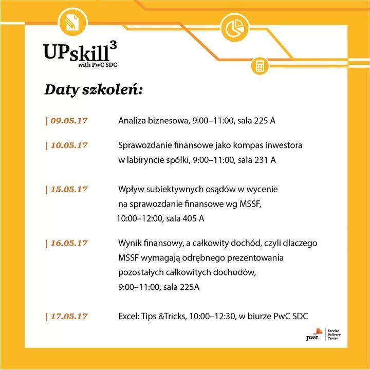 W dniu 26.04.2017 roku o godz. 15.20 w Auli CNTI im. Prof. Zbigniewa Messnera dr Magdalena Wójcik-Jurkiewicz z Katedry Rachunkowości uroczyście otworzyła drugi projekt z cyklu UPskill z PWC SDC nt. "Audyt kierunkowskazem na drodze sprawozdawczości finansowej".