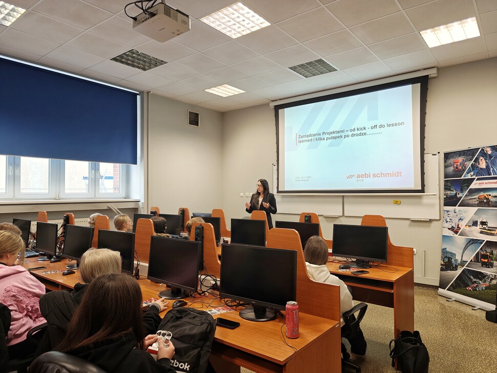 W dniu 24 listopada 2025 roku, studenci kierunku Gospodarka miejska i nieruchomości wzięli udział w specjalistycznym szkoleniu z zakresu zarządzania projektami, które poprowadziła Pani Emilia Strączek z firmy Aebi Schmidt Polska. Podczas wydarzenia uczestnicy mieli okazję zapoznać się z podstawami skutecznego zarządzania projektami oraz poznać praktyczne narzędzia i techniki, które wspierają realizację projektów w różnych branżach.