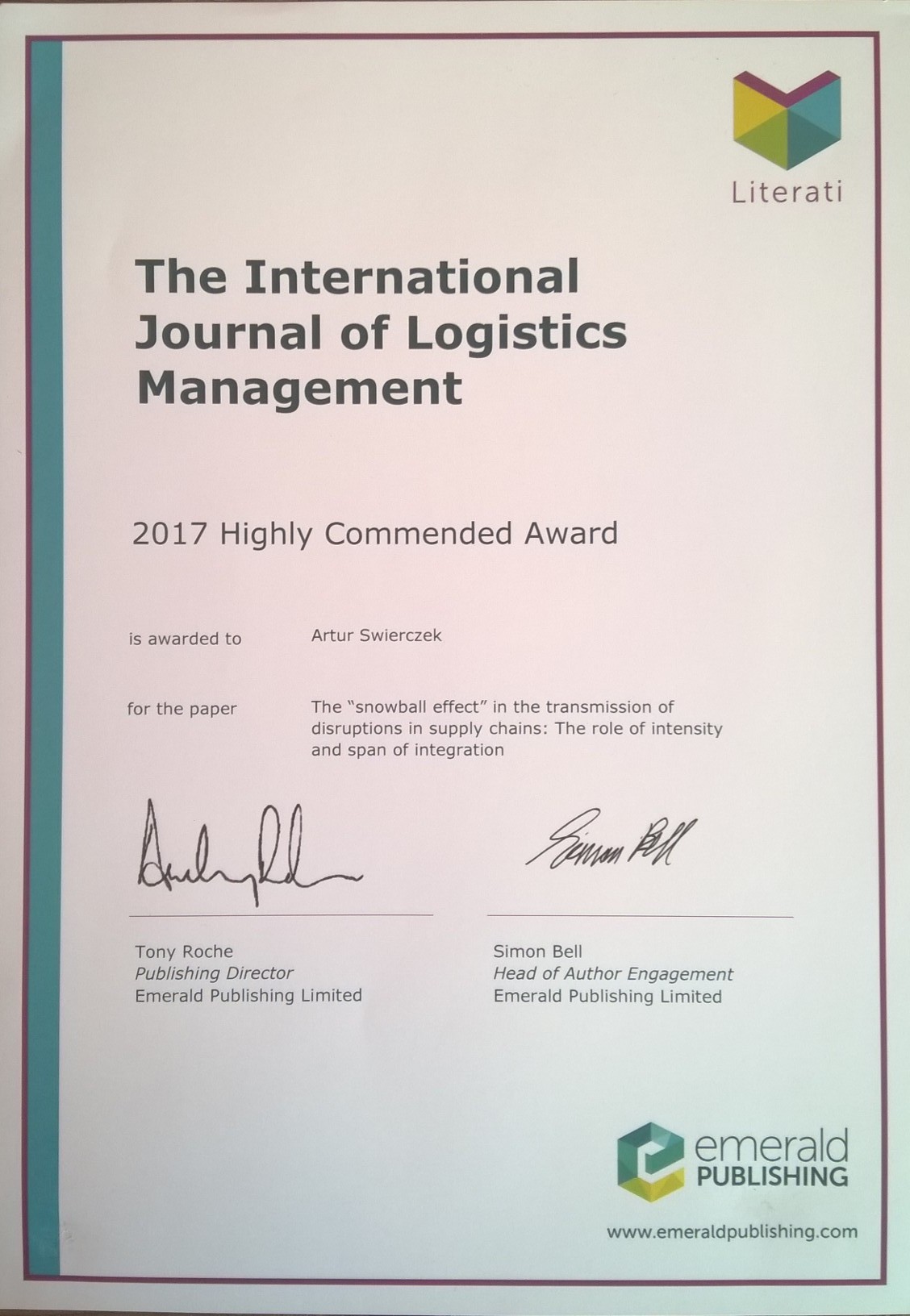Artykuł pracownika Katedry Logistyki Ekonomicznej dr. hab. Artura Świerczka, prof. UE, zatytułowany: "The ‘snowball effect’ in the transmission of disruptions in supply chains: The role of intensity and span of integration" został uznany za wyróżniający i otrzymał nagrodę Highly Commended paper in the 2017 Emerald Literati Network Awards for Excellence, przyznaną przez redakcję czasopisma The International Journal of Logistics Management, indeksowanego na liście JCR (lista filadelfijska – 5-letni IF = 2.061).