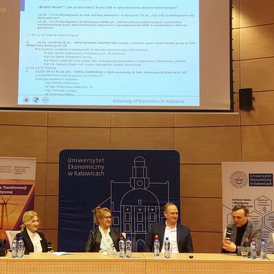 Drugi blok - ekspercki - łączący perspektywę nauki i biznesu, był moderowany przez dr hab. Małgorzatę Kieżel, prof. UE. W dyskusji uczestniczyli więc zarówno przedstawiciele nauki, jak i praktyki gospodarczej: dr hab. Monika Sulimowska-Formowicz, prof. UE (UE Katowice), mgr inż. Beata Kisielewska (TAURON) oraz mgr Marcin Jabłoński (wiceprezes Izby Gospodarczej Eksporterów i Importerów). Eksperci odnieśli się do kluczowych wyzwań stojących przed firmami w sektorze energetycznym i przemysłowym, takich jak: sukcesja i ryzyko demograficzne w przedsiębiorstwach; gotowość organizacyjna firm na inwestora (procesy, standardy zarządzania, governance); rosnące znaczenie kompetencji technologicznych i współpracy nauki z biznesem; wpływ regulacji i kapitału na rozwój projektów OZE.