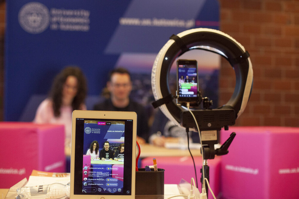 Podobnie, jak w ubiegłym roku Dzień Otwarty odbywał się nie tylko na terenie kampusu - aktywni byliśmy również w przestrzeni wirtualnej! Q&A (z ang. "questions and answers") odbywało się na żywo w mediach społecznościowych - Facebook i Instagram. Cieszyło się dużym zainteresowaniem - otrzymaliśmy kilkadziesiąt pytań i komentarzy, a sam program live dotarł aż do 7000 osób! Zobacz jak nasi pracownicy odpowiadają na pytania dotyczące rekrutacji i życia studenckiego na UE Katowice :)