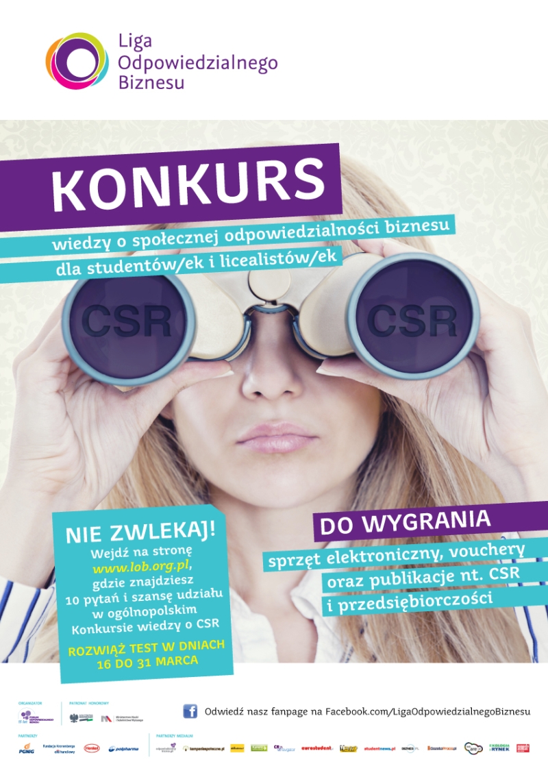 Rusza Konkurs CSR organizowany przez Ligę Odpowiedzialnego Biznesu, program edukacyjny Forum Odpowiedzialnego Biznesu. W dniach 16-31 marca br. licealiści i studenci z całej Polski będą mogli wziąć udział w teście online i dzięki temu zakwalifikować się do kolejnych etapów konkursu.