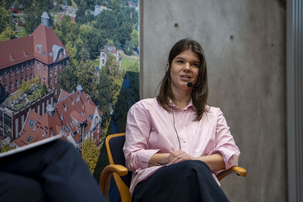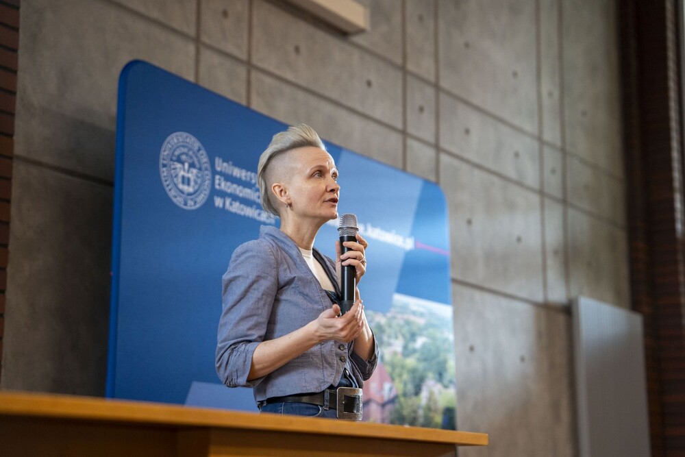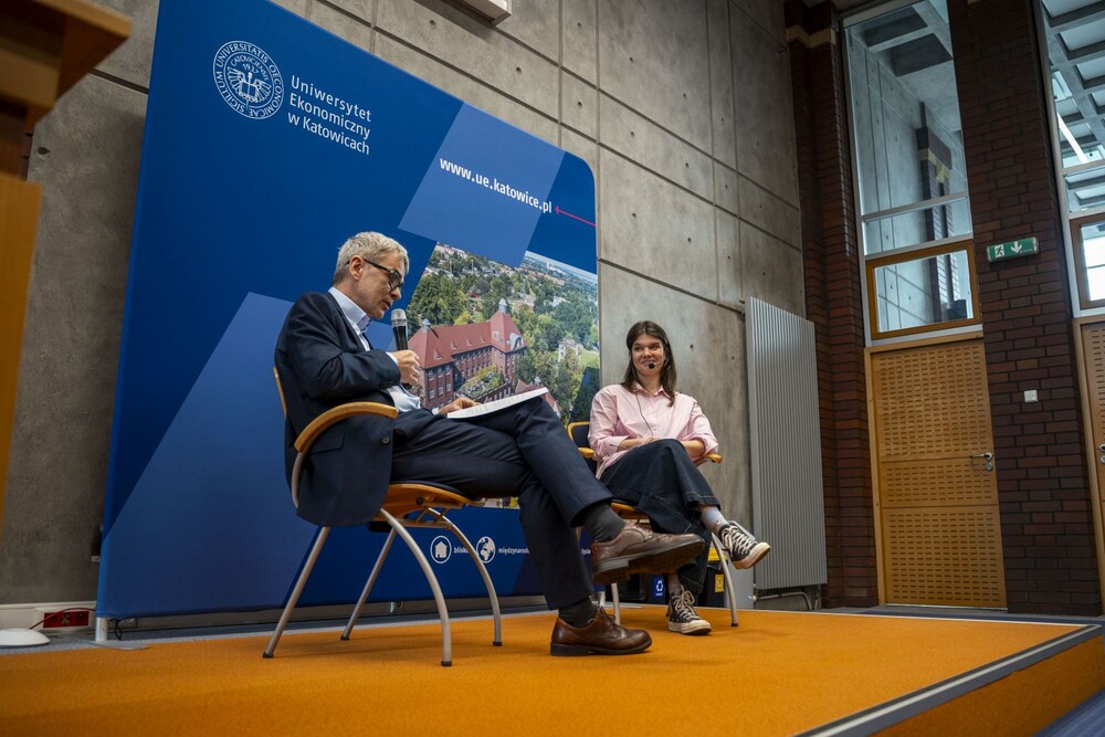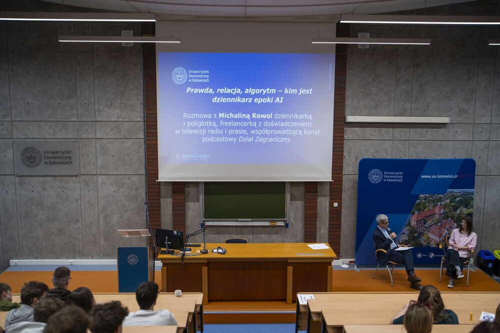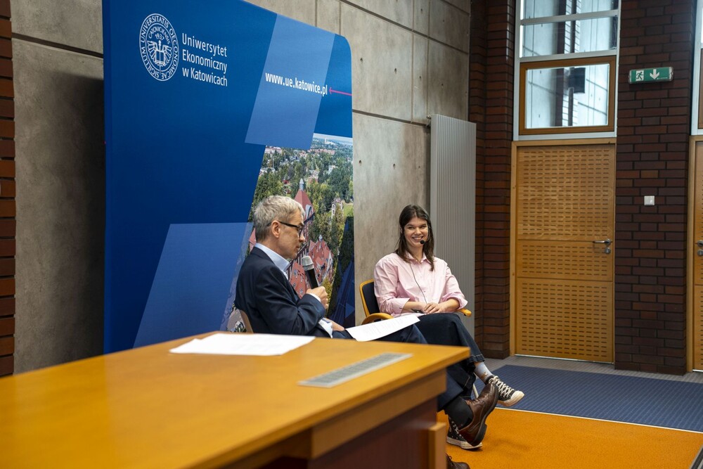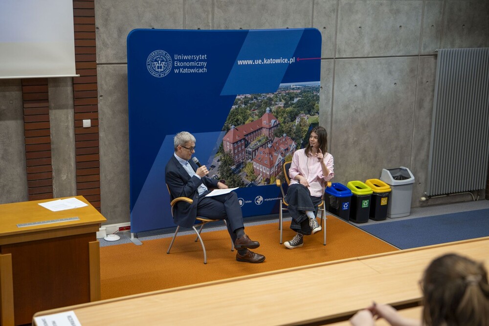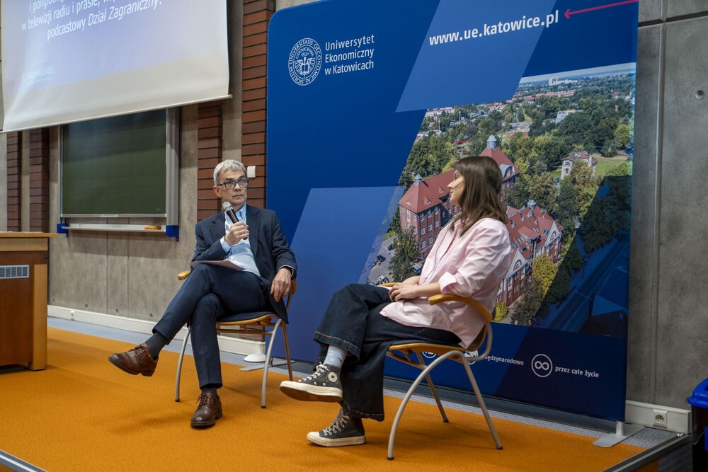 Na zakończenie miała miejsce inspirująca rozmowa z Michaliną Kowol dziennikarką i poliglotką, freelancerką z doświadczeniem w telewizji, radiu i prasie, współprowadzącą kanał podcastowy Dział Zagraniczny - "serwis o wydarzeniach na świecie, o których w polskich mediach słychać niewiele, albo wcale”. Z gościnią rozmawiał dr inż. Tomasz Zieliński, prof. UE.
