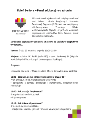 W ramach obchodów Dnia Seniora Miasto Katowice jako członek międzynarodowej sieci Miast i Gmin Przyjaznych Starzeniu Światowej Organizacji Zdrowia we współpracy z Uniwersytetem Trzeciego Wieku w Uniwersytecie Śląskim zaprasza na panel edukacyjny o zdrowiu.