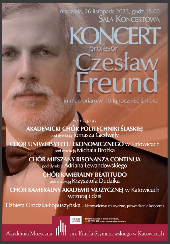 zapraszamy na koncert "Profesor Czesław Freund in memoriam" z okazji 10-tej rocznicy śmierci do Sali koncertowej Akademii Muzycznej im. Karola Szymanowskiego w Katowicach, który odbędzie się 26 listopada 2023 r. (niedziela) o godz. 18:00.