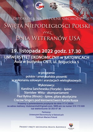 zapraszamy na koncert z okazji Święta Niepodległości Polski i Dnia Weteranów USA, który odbędzie się dnia 19.11.2022 r. (sobota) o godz. 17:30 w auli CNTI, ul. Bogucicka 5.