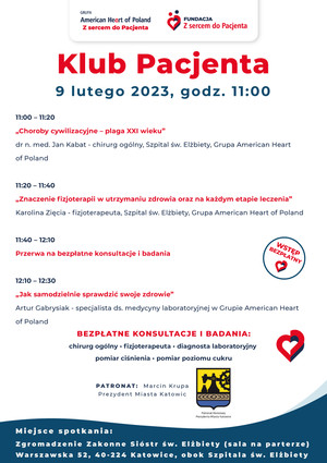 zapraszamy na spotkanie do Klubu Pacjenta w Katowicach, którego organizatorem jest Fundacja "Z sercem do Pacjenta", a patronat nad wydarzeniem objął Prezydent Miasta Katowic Marcin Krupa.