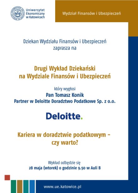28 maja (wtorek) o godz. 9.50 w Auli B odbędzie się Drugi Wykład Dziekański na Wydziale Finansów i Ubezpieczeń, który wygłosi Pan Tomasz Konik, Partner w Deloitte Doradztwo Podatkowe Sp. z o.o.