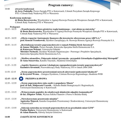 - 11:35 - 11:55 - "Aspekty finansowe, prawne i ekologiczne zagospodarowania terenów poprzemysłowych" - Kazimierz Kwaśniak, Przewodniczący Rady Nadzorczej TFS w latach 2006-2008