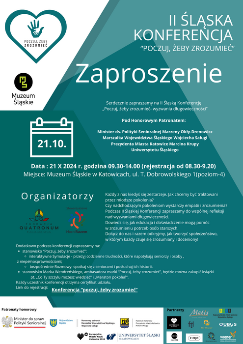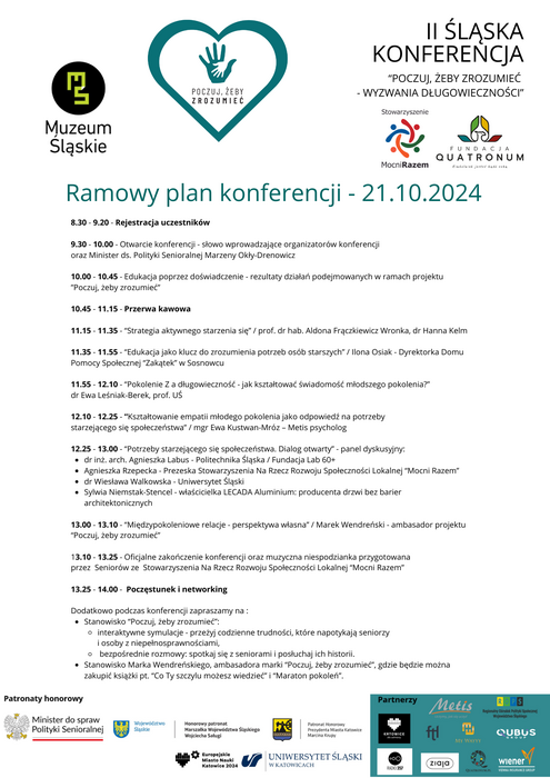 Serdecznie zapraszamy na konferencję organizowaną przez Stowarzyszenie Mocni Razem i Fundację Quatronum ”Poczuj, żeby zrozumieć, budujemy międzypokoleniowe mosty”. Jest ona wstępem do realizacji projektu, w którym przybliżane będą ograniczenia w funkcjonowaniu osób starszych uczniom, przedstawicielom instytucji i firm z wykorzystaniem symulatora starości.