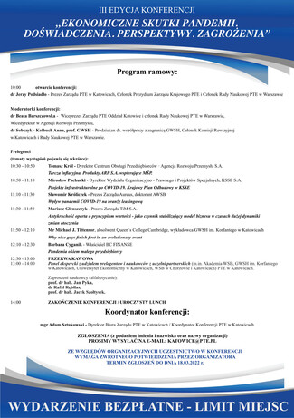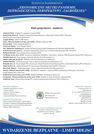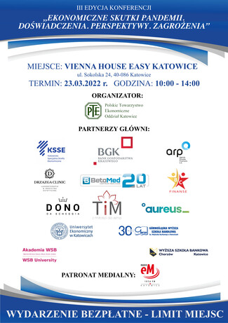 Polskie Towarzystwo Ekonomiczne zaprasza do udziału w III edycji wydarzenia, które na stałe wpisało się do kalendarza konferencji PTE w Katowicach. Pierwsza w tym roku konferencja Towarzystwa odbędzie się 23 marca, a jej uczestnicy debatować będą nt. ekonomicznych skutków pandemii.