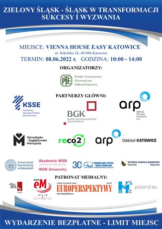 Polskie Towarzystwo Ekonomiczne Oddział Katowice serdecznie zaprasza do udziału w bezpłatnej Konferencji pt. "Zielony Śląsk - Śląsk w transformacji. Sukcesy i wyzwania", która odbędzie się 8 czerwca 2022 r. w godz. 10:00-14:00 w Hotelu Vienna House Easy Katowice (ul. Sokolska 24). Partnerem wydarzenia jest Uniwersytet Ekonomiczny w Katowicach. Do udziału w panelu eksperckim zaproszony został prof. dr hab. inż. Jacek Szołtysek, Kierownik Katedry Logistyki Ekonomicznej naszej Uczelni.