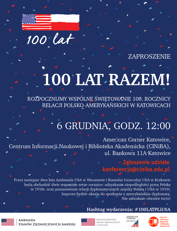 6 grudnia 2017 r. o godzinie 12:00 serdecznie zapraszamy do sali Konferencyjnej CINiB-y na uroczystą inaugurację obchodów 100-lecia współpracy polsko-amerykańskiej.
