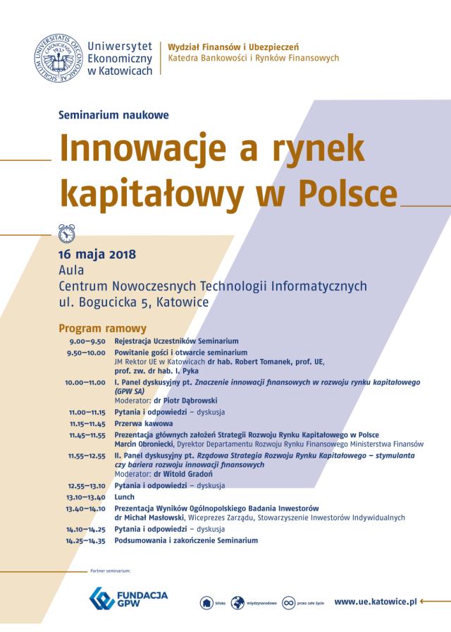 16 maja br. w Auli CNTI odbędzie się seminarium naukowe pt.: "Innowacje a rynek kapitałowy w Polsce". Celem seminarium jest prezentacja zmian jakie zachodzą na rynku kapitałowym w Polsce, a w szczególności rynku giełdowym w związku z szeroko pojętymi innowacjami finansowymi oraz opracowaną przez Ministerstwo Finansów Strategią Rozwoju Rynku Kapitałowego.