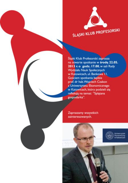Zapraszamy na wykład prof. dr hab. Wojciecha Czakona nt. "Splątana Gospodarka" w ramach spotkań Śląskiego Klubu Profesorskiego, który odbędzie się 22 maja br. o godz. 17.00 w sali Rady Wydziału Nauk Społecznych UŚ w Katowicach, przy ul. Bankowej 11.