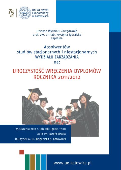 Uroczystość wręczenia dyplomów Absolwentom rocznika 2011/2012 odbędzie się 25 stycznia 2013 r. o godz. 17:00 w Auli im. Józefa Lisaka (Budynek A, ul. Bogucicka 3).