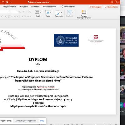 III miejsce - Nguyen Thi Yen Nhi, autorka pracy zatytułowanej "The Impact of Corporate Governance on Firm Performance: Evidence from Polish Nonfinancial Listed Firms." Praca została napisana na Uniwersytecie Ekonomicznym w Poznaniu pod kierunkiem dr hab. Konrada Sobańskiego.