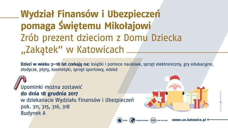 Po raz kolejny Wydział Finansów i Ubezpieczeń organizuje zbiórkę dla dzieci z Domu Dziecka "Zakątek" w Katowicach. Upominki można zostawiać w dziekanacie WFiU do 18 grudnia 2017 r.
