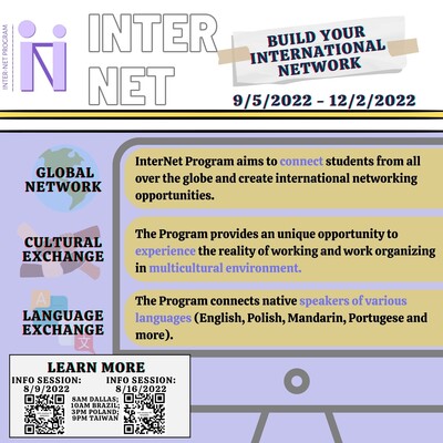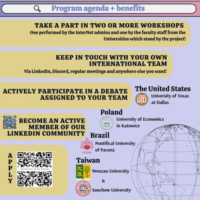 W ubiegłym roku akademickim grupa studentów z różnych uczelni na całym świecie rozpoczęła aktywną współpracę, która zaowocowała powstaniem Projektu InterNet. Udział wzięła w nim liczna grupa uczniów z UT Dallas w Stanach Zjednoczonych, PUCPR w Brazylii, FuJen University i Wenzao University z Tajwanu oraz UE w Katowicach! Ze względu na sukces Projektu, właśnie ruszyła rekrutacja do drugiej edycji!