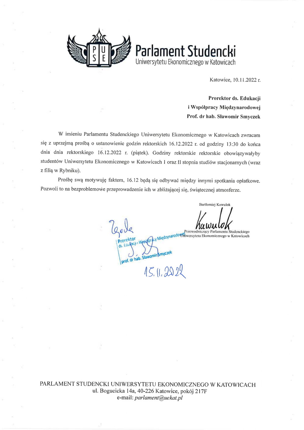 W związku ze spotkaniami opłatkowymi w dniu 16 grudnia 2022 r. na wniosek Parlamentu Studenckiego Prorektor ds. Edukacji i Internacjonalizacji prof. dr hab. Sławomir Smyczek wyraził zgodę, aby w dniu 16 grudnia br. obowiązywały godziny rektorskie od 13:30 do końca dnia.