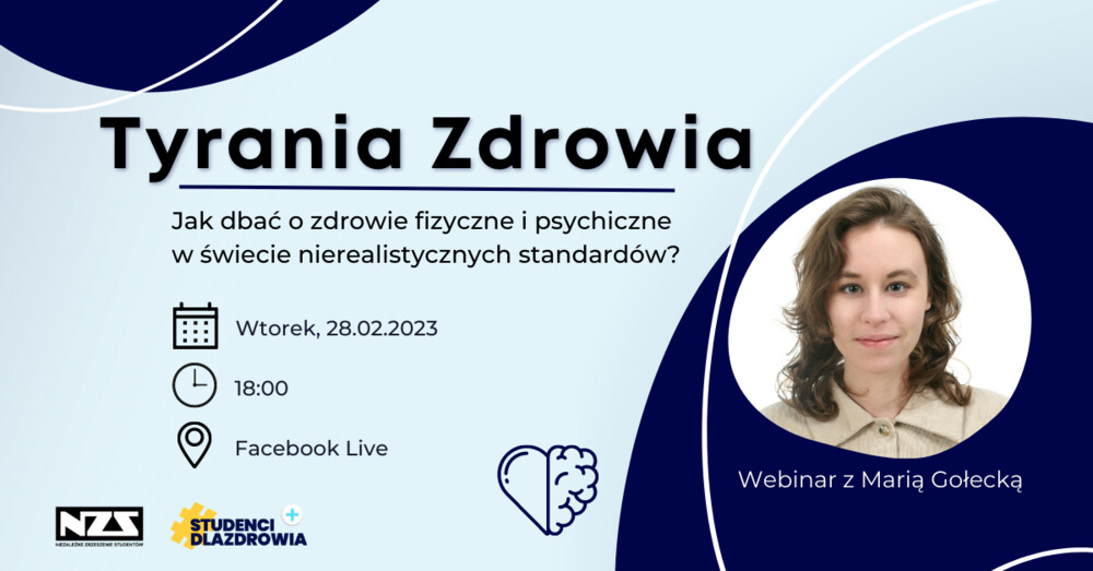 Kolejny webinar, na który chcemy Was zaprosić to "Tyrania zdrowia - Jak dbać o zdrowie fizyczne i psychiczne w świecie nierealistycznych standardów?". Prelegentką podczas webinaru będzie Maria Gołecka, która opowie więcej o tym, jak trendy z social mediów, np. trend that girl kształtują nasze standardy dotyczące zdrowia, skąd się bierze zdrowie, czy nasze zdrowie jest całkowicie w naszych rękach, a także wyjaśni takie zjawiska jak healthism, medykalizacja oraz kultura terapeutyczna.