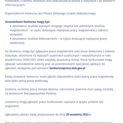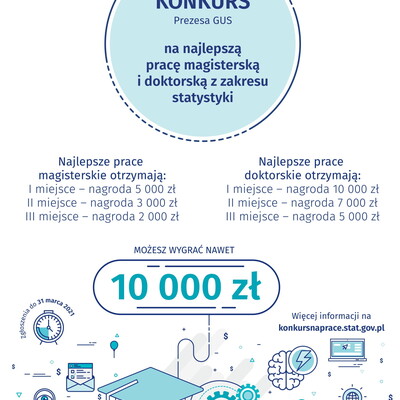 Wciąż trwa Konkurs Prezesa GUS na najlepszą pracę magisterską i doktorską z zakresu statystyki. Termin na przesyłanie zgłoszeń został wydłużony do 30 września br. W tegorocznej edycji można zgłaszać prace obronione na wyższych uczelniach publicznych i niepublicznych w roku akademickim 2020/2021.