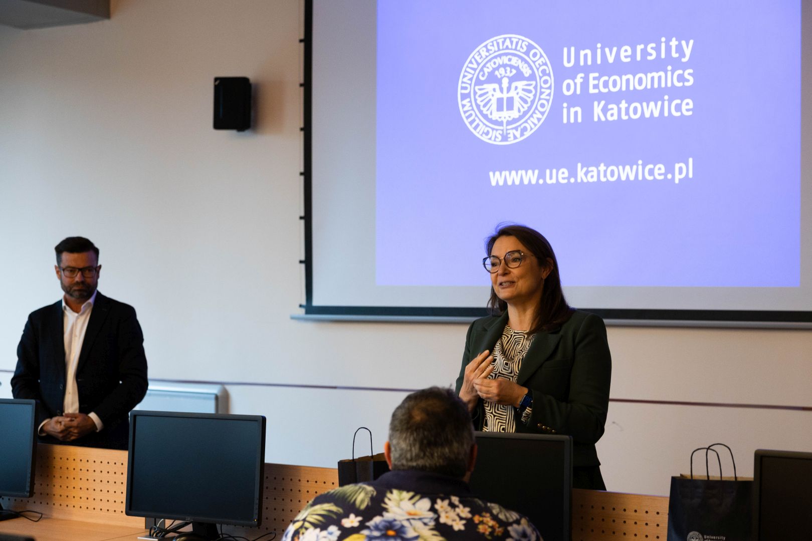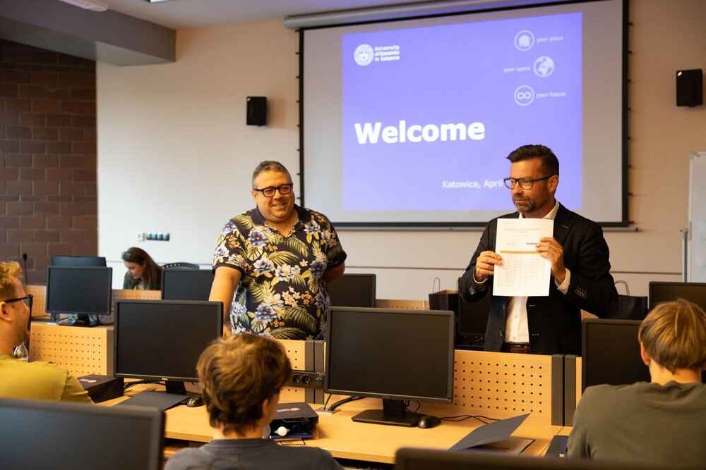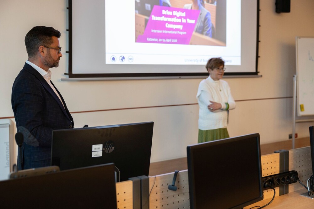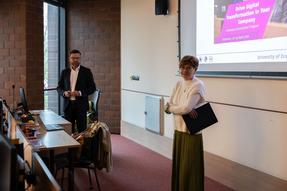 Pierwszego dnia, 20 kwietnia, uczestnicy międzynarodowego projektu "Drive Digital Transformation in Your Company" zostali serdecznie powitani przez Kierownika Katedry Badań Konsumpcji prof. dr hab. Sławomira Smyczka oraz Prodziekan Kolegium Studiów dr Mirosławę Malinowską.