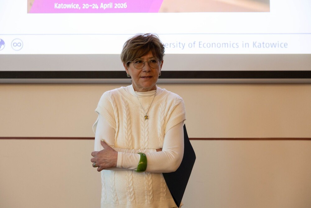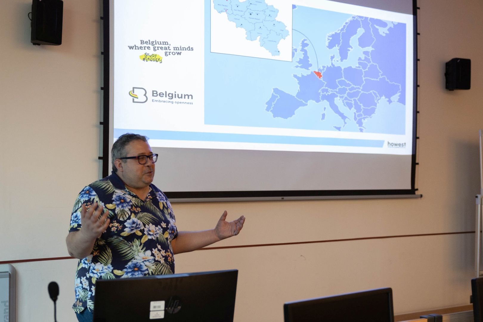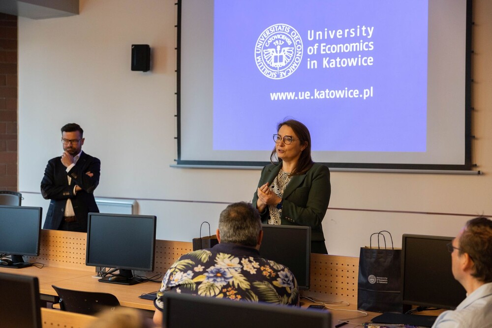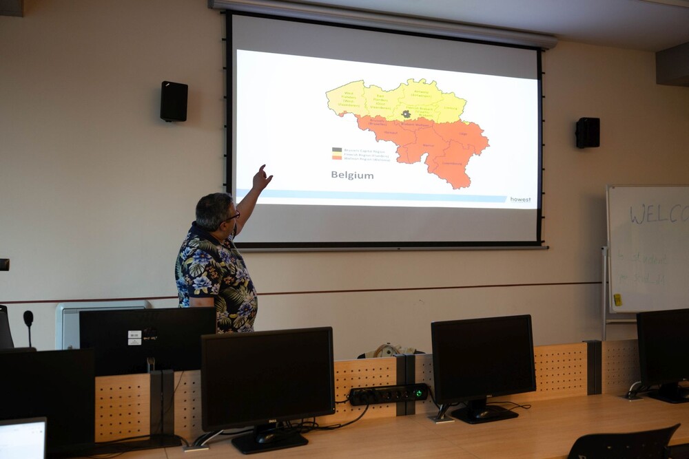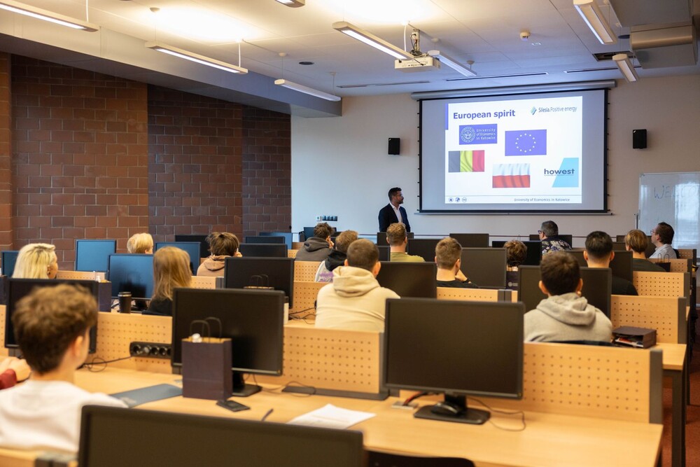 Następnie dr hab. Justyna Ganassali, prof. UE oraz goszczący wykładowca Frédéric Vlummens przybliżyli uczestnikom swoje miasta i uczelnie, umożliwiając zarówno studentom z Belgii, jak i z Polski lepsze poznanie kultur akademickich oraz realiów życia w obu krajach.