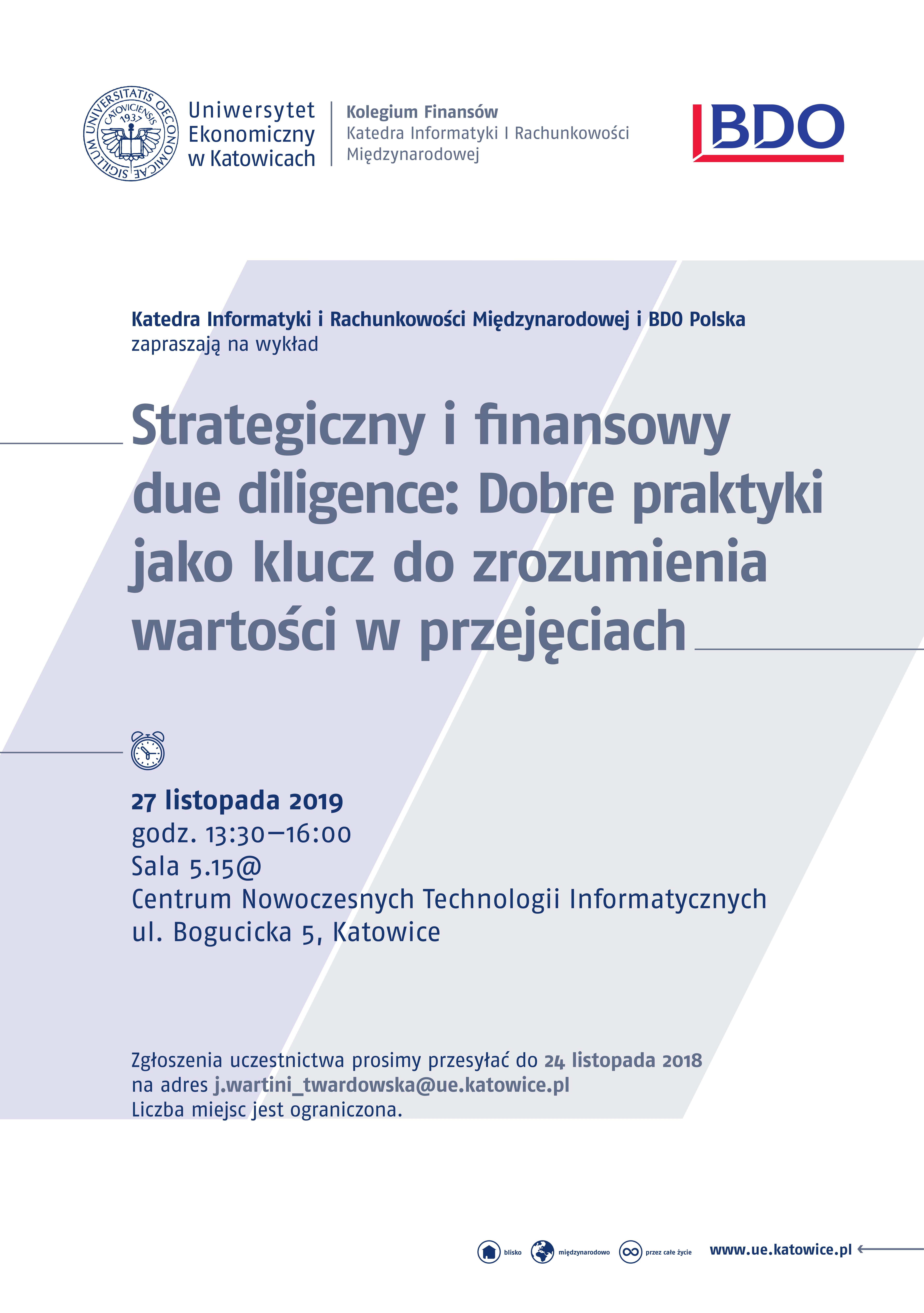 Katedra Informatyki i Rachunkowości Międzynarodowej zaprasza serdecznie na warsztaty poświęcone Strategicznemu i finansowemu due diligence, w szczególności dobrym praktykom ich opracowania. Warsztaty odbędą się w dniu 27 listopada br., w godz. 13:30-16:00, w sali 5.15@ CNTI.