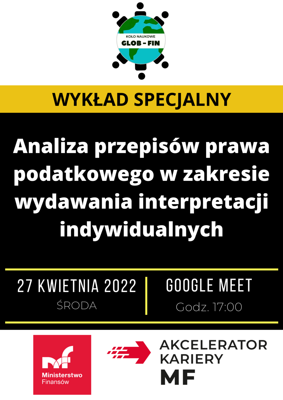 Serdecznie zapraszamy na wykład specjalny Koła Naukowego GLOB-FIN pt. "Analiza przepisów prawa podatkowego w zakresie wydawania interpretacji indywidualnych" współorganizowany we współpracy z Ministerstwem Finansów, który poprowadzi Pani Beata Andrzejewska - naczelnik wydziału Orzecznictwa w Sprawach Ordynacji Podatkowej.