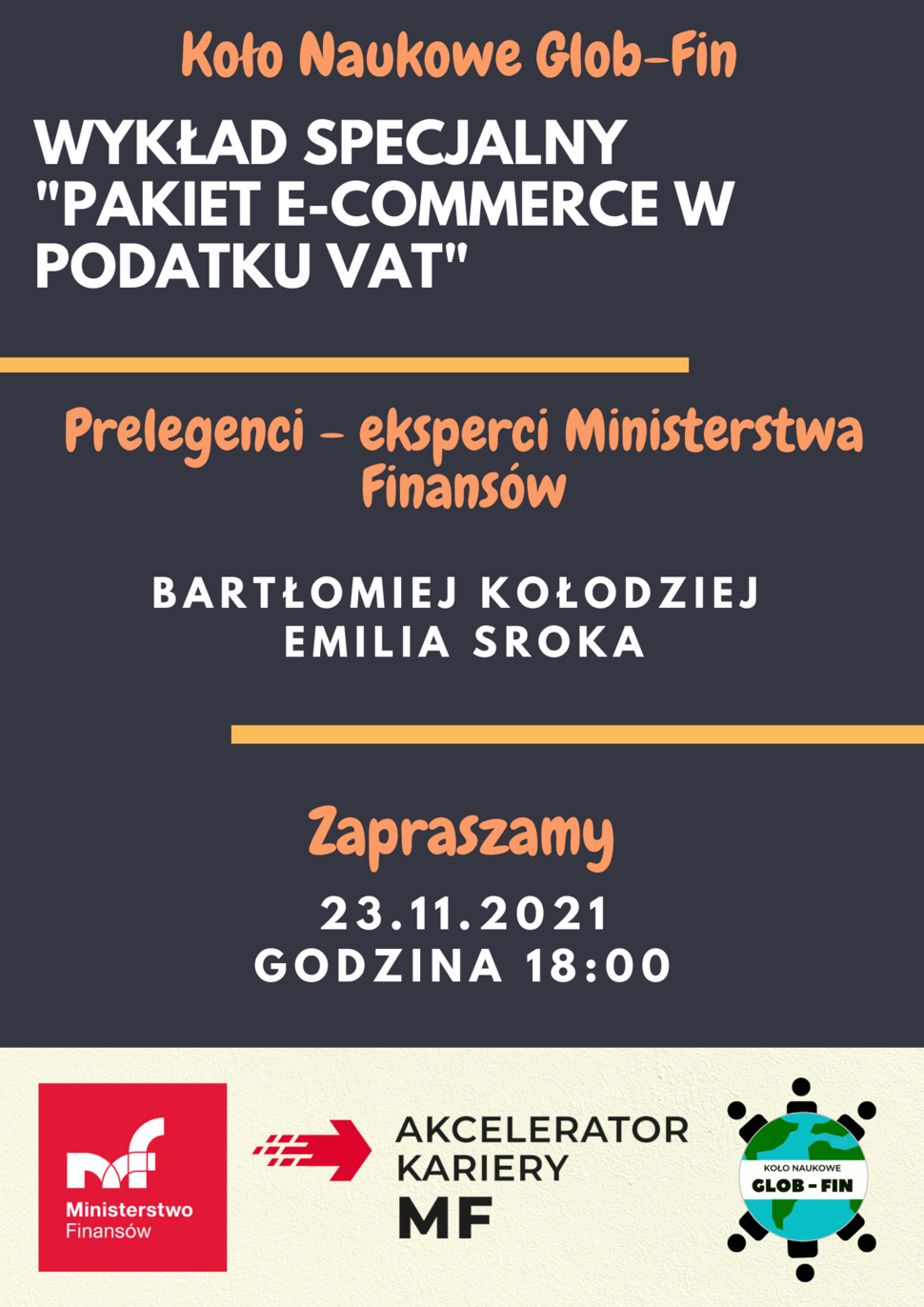 Wykład pt. "Pakiet e-commerce w podatku VAT" 23 listopada 2021 r. o godzinie 18:00 poprowadzą eksperci Ministerstwa Finansów - Bartłomiej Kołodziej oraz Emilia Sroka.