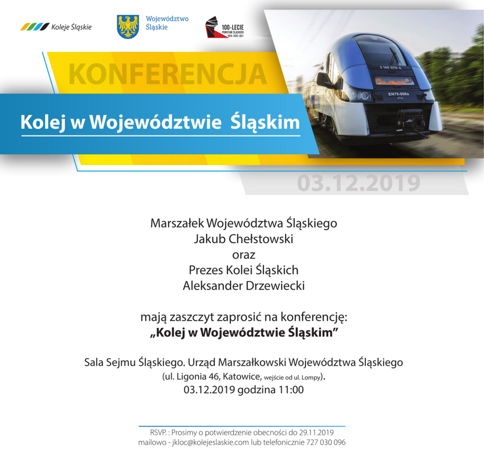 Marszałek Województwa Śląskiego Jakub Chełstowski oraz Prezes Kolei Śląskich Aleksander Drzewiecki mają zaszczyt zaprosić na konferencję pt."Kolej w Województwie Śląskim". Konferencja odbędzie się w Sali Sejmu Śląskiego 3 grudnia 2019 r. o godz. 11:00.