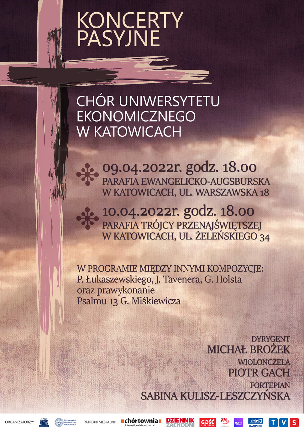 Koncerty w wykonaniu Chóru Uniwersytetu Ekonomicznego odbędą się 9 kwietnia 2022 r. (sobota) o godz. 18:00 w Parafii Ewangelicko-Augsburskiej w Katowicach oraz 10 kwietnia 2022 r. (niedziela) o godz. 18:00 w Parafii Trójcy Przenajświętszej w Kostuchnie.