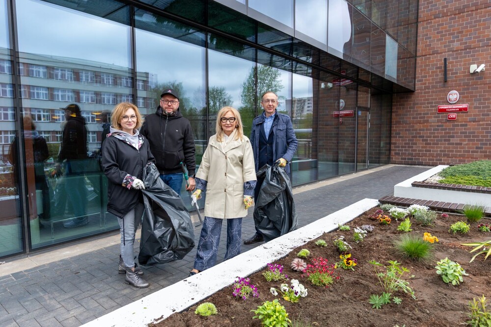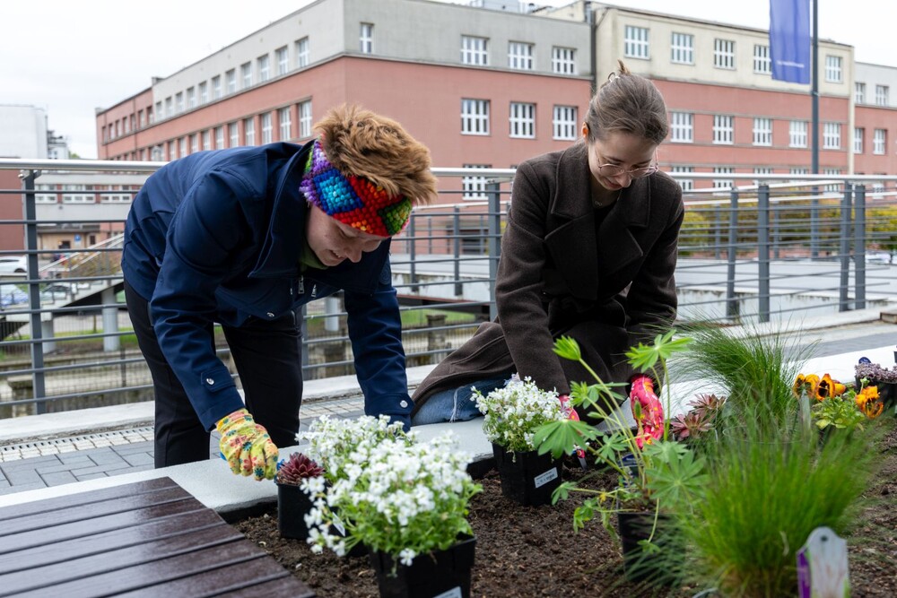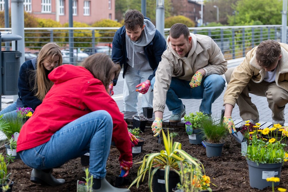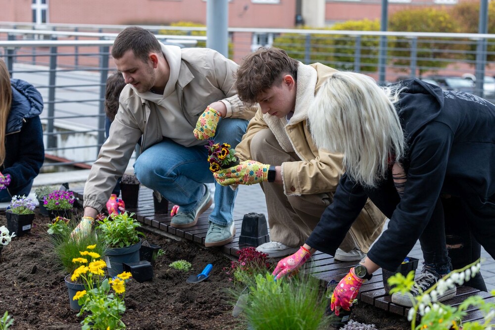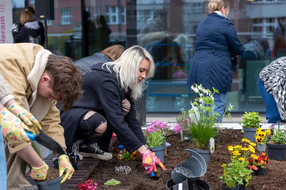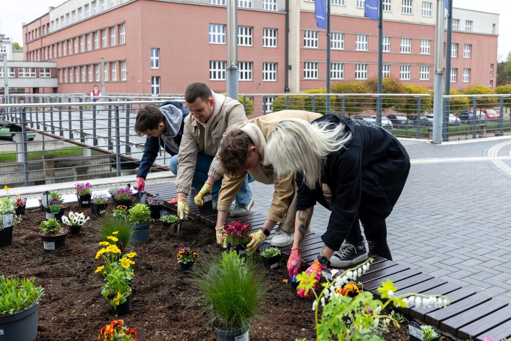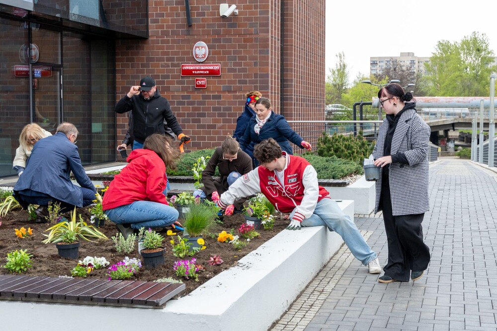 Wydarzenie miało nie tylko symboliczny charakter, ale przede wszystkim bardzo konkretny wpływ na najbliższe otoczenie kampusu. Uczestnicy aktywnie zaangażowali się w sadzenie roślin i kwiatów, dzięki czemu przestrzeń wokół Uczelni zyskała nowe, kolorowe punkty przyjazne owadom, a jednocześnie estetyczne i przyjemne miejsce na spędzenie czasu podczas przerw między zajęciami.