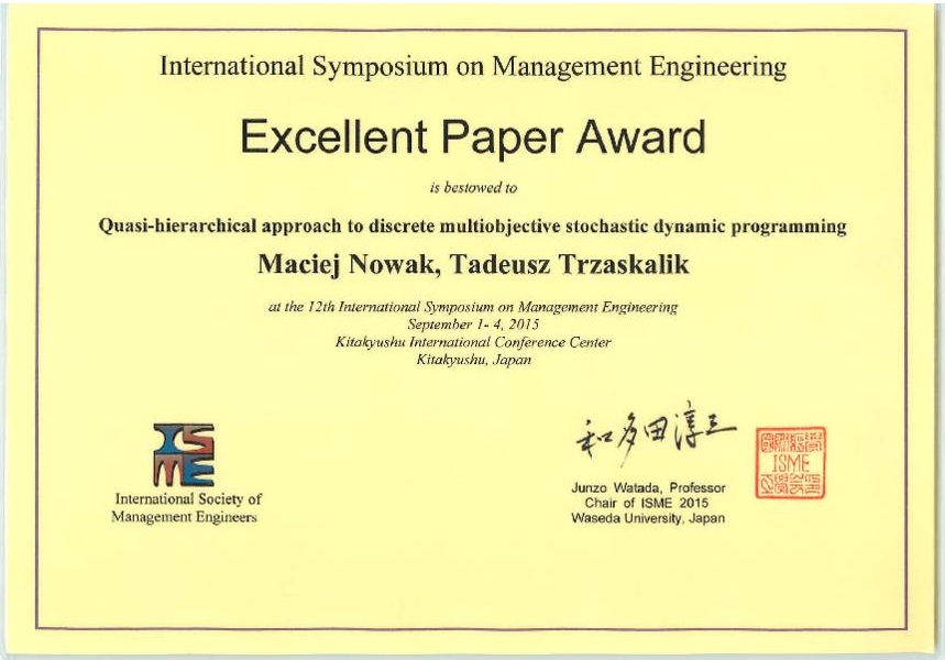 Konferencja odbyła się w dniach 1 - 4 września 2015 roku w Kitakyushu (Japonia). Praca nosi tytuł: "Quasi-hierarchical approach to discrete multiobjective stochastic dynamic programming". Podczas konferencji wyróżnione zostały 3 prace spośród 40 ocenianych prac.