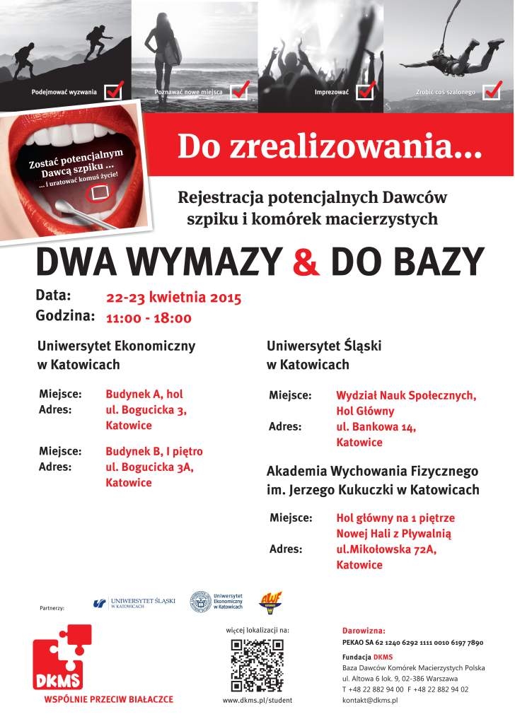 22 i 23 kwietnia br. to unikalne wydarzenie połączy wszystkich – nie tylko środowisko akademickie - wokół wspólnego celu, jakim jest powiększenie bazy niespokrewnionych Dawców szpiku. Studenci zapraszają wszystkich zainteresowanych rejestracją. Niech mury uniwersyteckie nie będą dla nikogo przeszkodą!