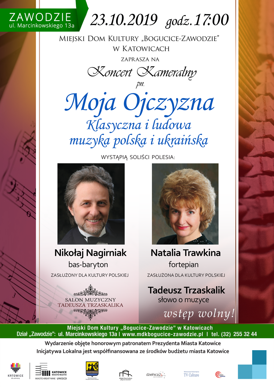 Zapraszamy na koncert z cyklu Salon muzyczny Tadeusza Trzaskalika, pt. Moja Ojczyzna, nad którym w roku 2019 objął patronat honorowy Pan Prezydent Miasta Katowice, dr Marcin Krupa. Wybrzmi wspaniała klasyczna i ludowa muzyka polska czy ukraińska.