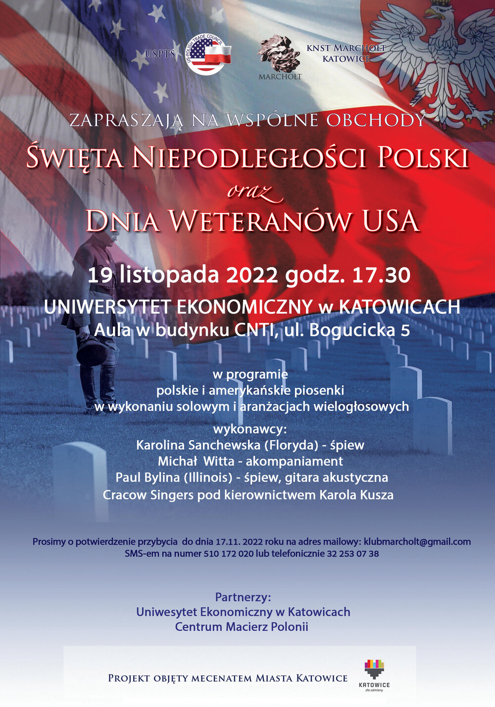 19 listopada br. o godz.17:30 w auli CNTI Uniwersytetu Ekonomicznego w Katowicach odbędzie się koncert organizowany z okazji Święta Niepodległości Polski i Dnia Weteranów USA. W programie polskie i amerykańskie piosenki w wykonaniu solowym i aranżacjach wielogłosowych. Projekt został objęty Mecenatem Miasta Katowice. Serdecznie zapraszamy!
