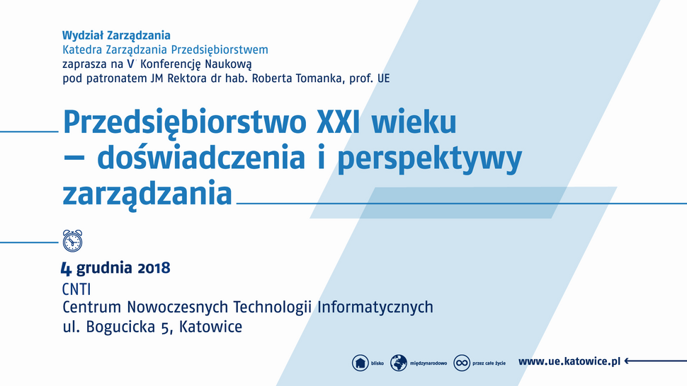Kierownictwo Katedry Zarządzania Przedsiębiorstwem Wydziału Zarządzania, Uniwersytetu Ekonomicznego w Katowicach serdecznie zaprasza na konferencję naukową pt. "Przedsiębiorstwo XXI wieku - doświadczenia i perspektywy zarządzania", która odbędzie się 4 grudnia 2018 r. w Centrum Nowoczesnych Technologii Informatycznych (CNTI), sala 2/19, ul. Bogucicka 5.