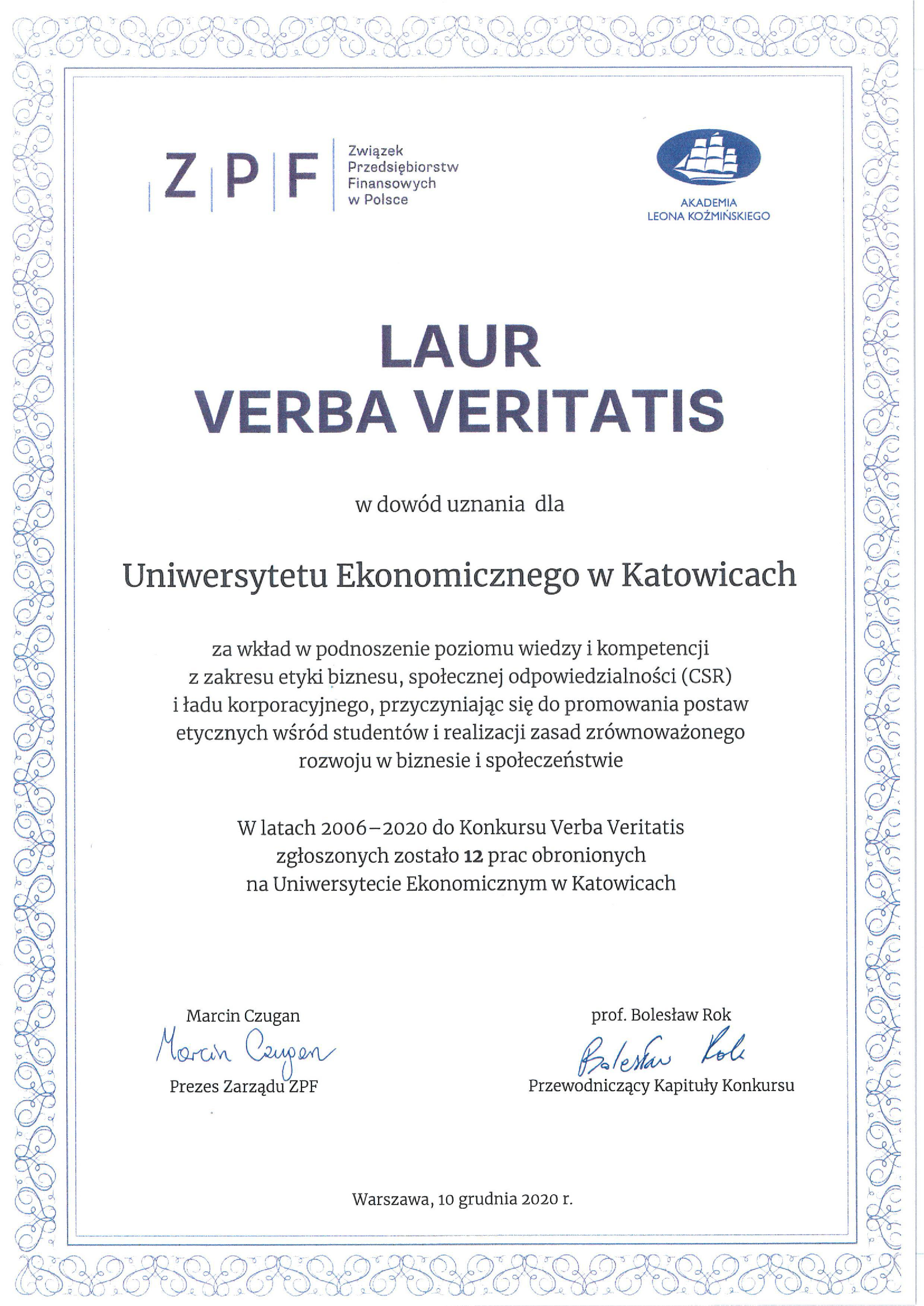 Uniwersytet Ekonomiczny w Katowicach został uhonorowany Laurem Verba Veritatis w dowód uznania za wkład w podnoszenie poziomu wiedzy i kompetencji z zakresu etyki biznesu, społecznej odpowiedzialności (CSR) i ładu korporacyjnego, przyczyniając się do promowania postaw etycznych wśród studentów i realizacji zasad zrównoważonego rozwoju w biznesie i społeczeństwie.