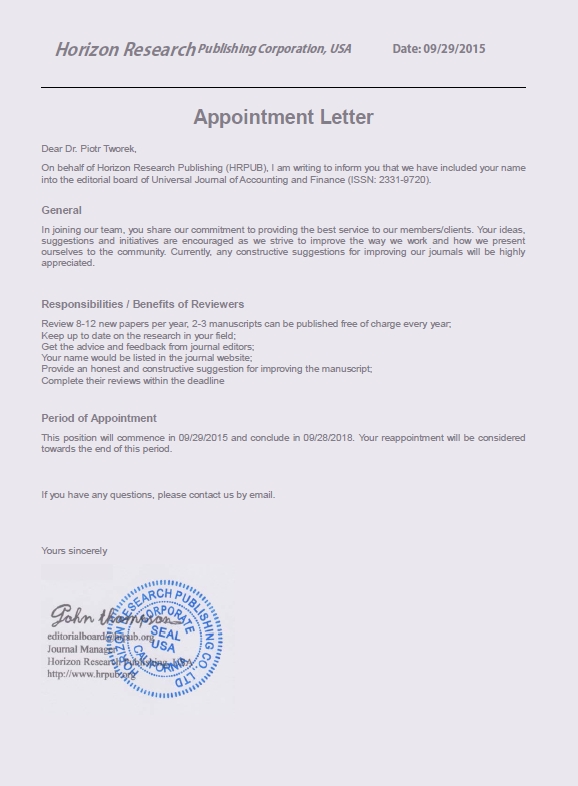 Dr Piotr Tworek, pracownik Katedry Zarządzania Publicznego i Nauk Społecznych został powołany w skład Komitetu Redakcyjnego (Editorial Board) międzynarodowego czasopisma naukowego "Universal Journal of Accounting and Finance" wydawanego przez platformę Horizon Research Publishing Corporation (HRPUB) w Kalifornii w Stanach Zjednoczonych. Jest to równoznaczne w pełnieniem funkcji recenzenta artykułów naukowych oraz współtworzenia redakcji naukowej tego czasopisma w okresie od 29 września 2015 r. do 28 września 2018 r.