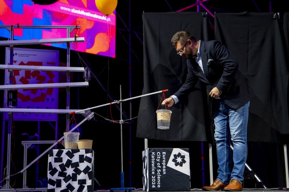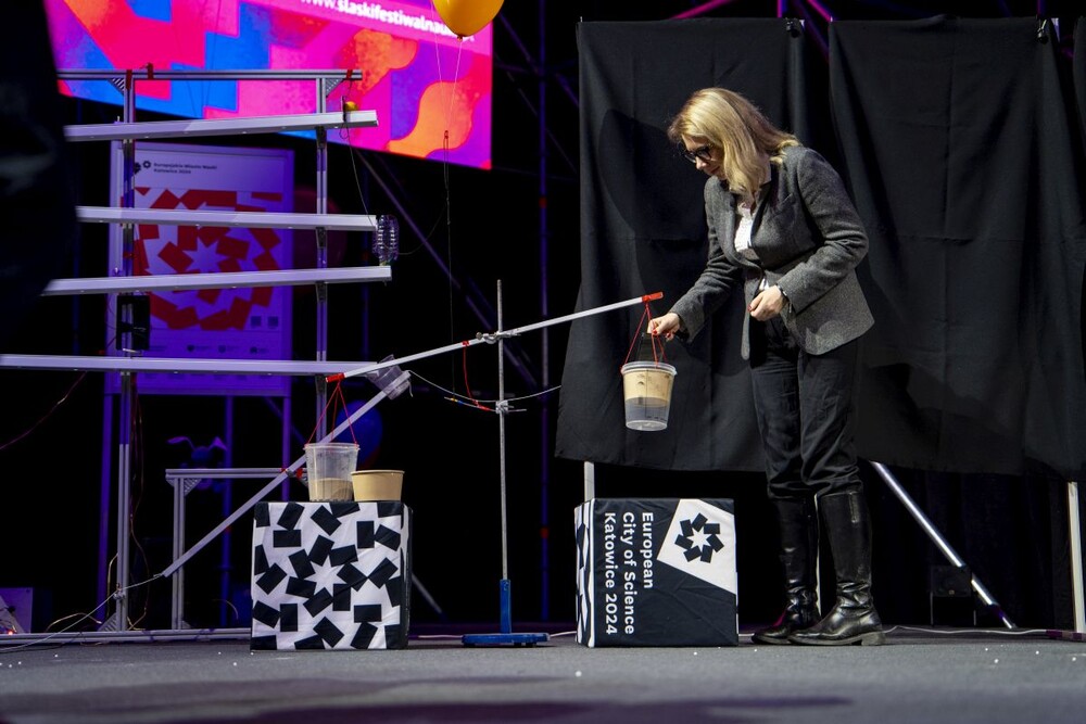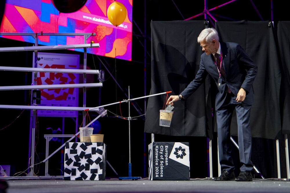 Do uczestników wydarzenia przemówił JM Rektor Uniwersytetu Śląskiego prof. dr hab. Ryszard Koziołek. Po jego wystąpieniu przeprowadzono tytułowy eksperyment – uruchomienie Maszyny Goldberga przez gości zgromadzonych na scenie głównej. Pokaz ukazał, jak pojedynczy impuls potrafi uruchomić cały łańcuch następujących po sobie zdarzeń. Była to nie tylko efektowna prezentacja energii i wzajemnych zależności, lecz także symboliczna metafora procesu zmian i rozwoju.