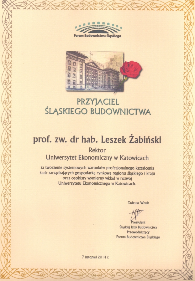 10 czerwca br. JM Rektor Uniwersytetu Ekonomicznego w Katowicach prof. zw. dr hab. Leszek Żabiński został uhonorowany tytułem "Przyjaciel Śląskiego Budownictwa".