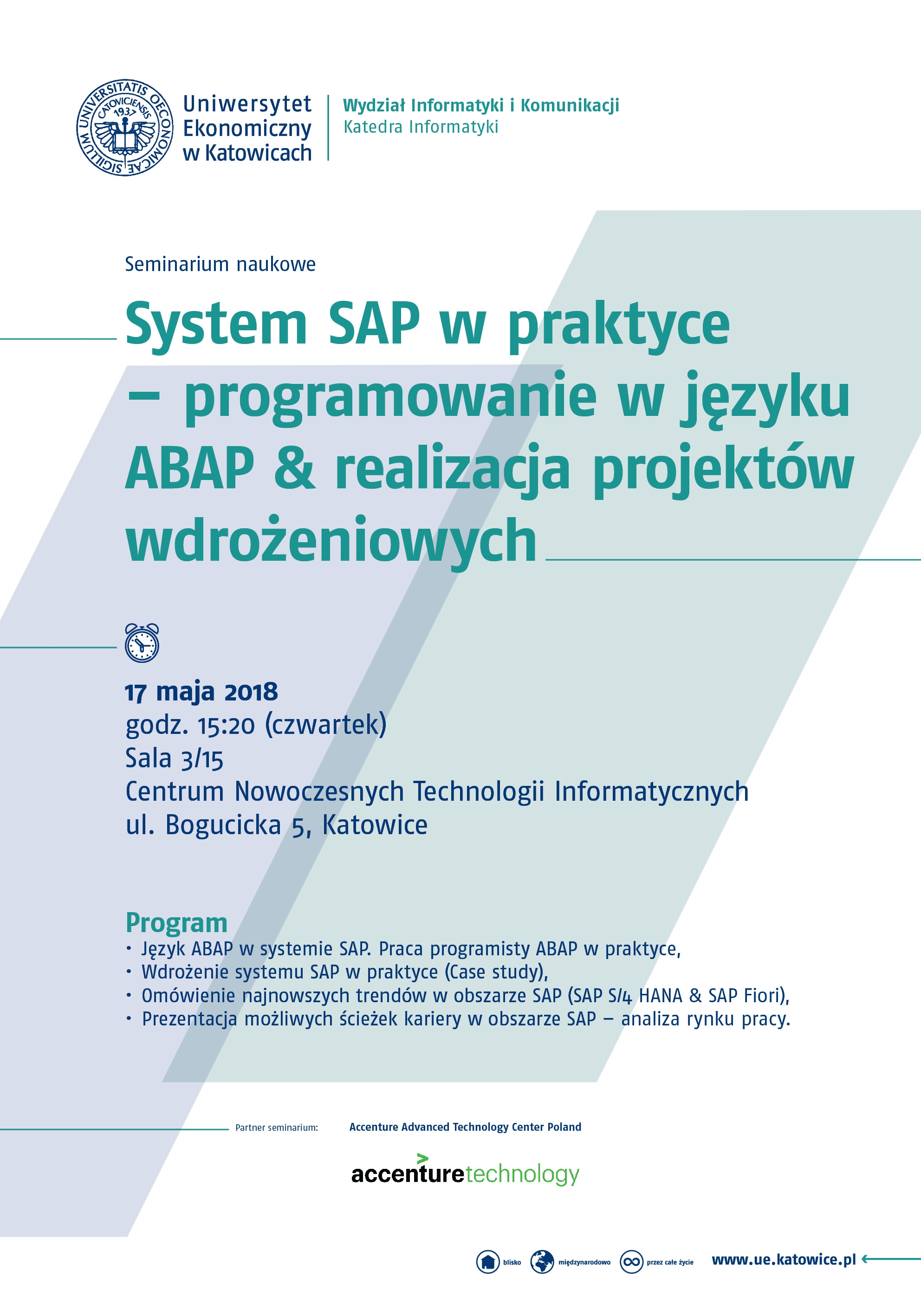 Katedra Informatyki WIiK organizuje dla pracowników i studentów UE Katowice w dniu 17 maja br. (czwartek) seminarium naukowe pt. "System SAP w praktyce – programowanie w języku ABAP & realizacja projektów wdrożeniowych".