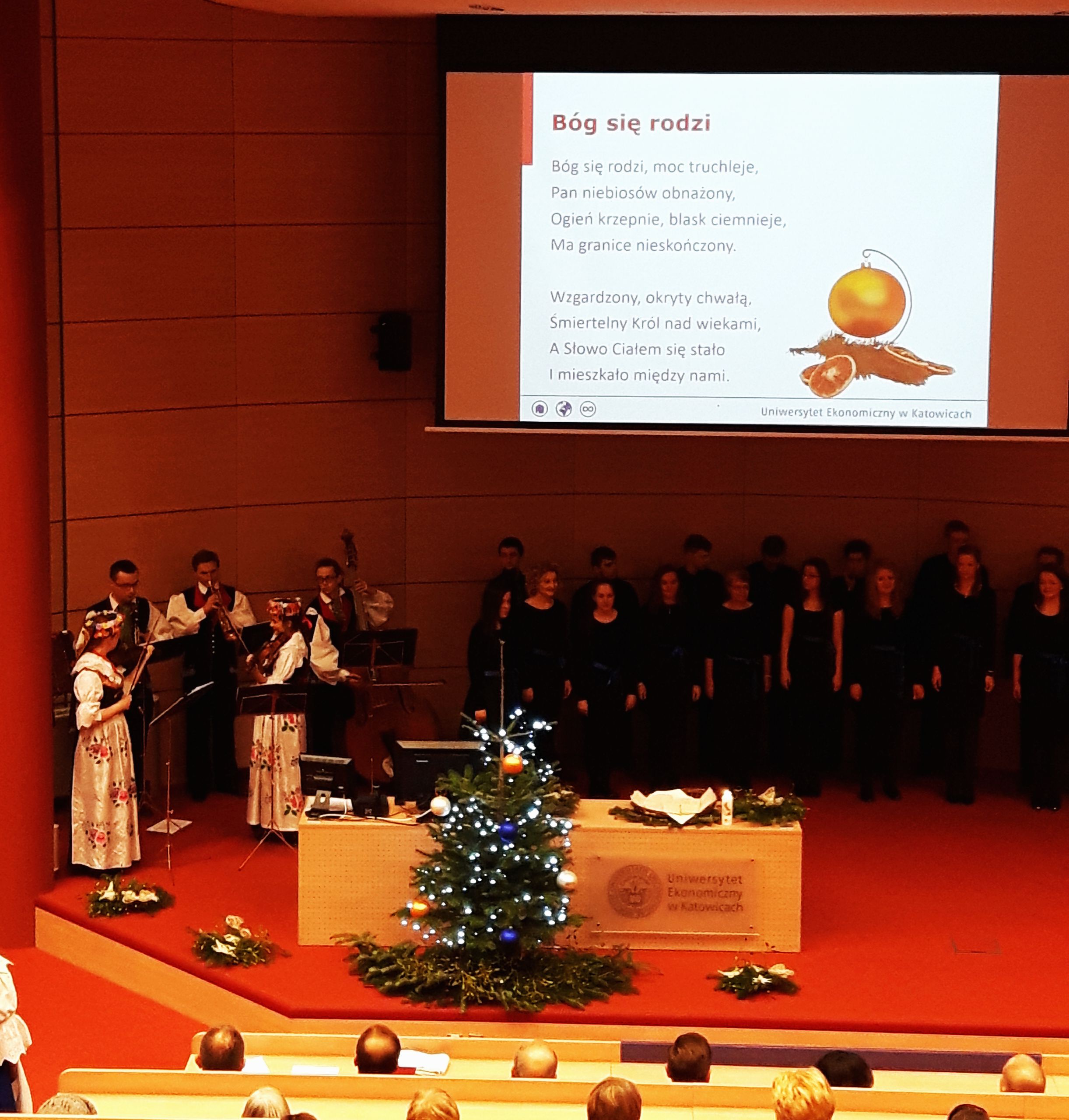 Z okazji nadchodzących Świąt Bożego Narodzenia 17 grudnia br. na Uniwersytecie Ekonomicznym w Katowicach odbyło się tradycyjne spotkanie opłatkowe przy śpiewie kolęd i pastorałek Chóru Uczelni oraz Zespołu Pieśni i Tańca "Silesianie".