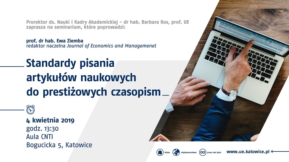 Prorektor ds. Nauki i Kadry Akademickiej - dr hab. Barbara Kos, prof. UE zaprasza na seminarium pt. "Standardy pisania artykułów naukowych do prestiżowych czasopism", które odbędzie się 4 kwietnia 2019 r. o godz. 13:30 w Auli CNTI.
