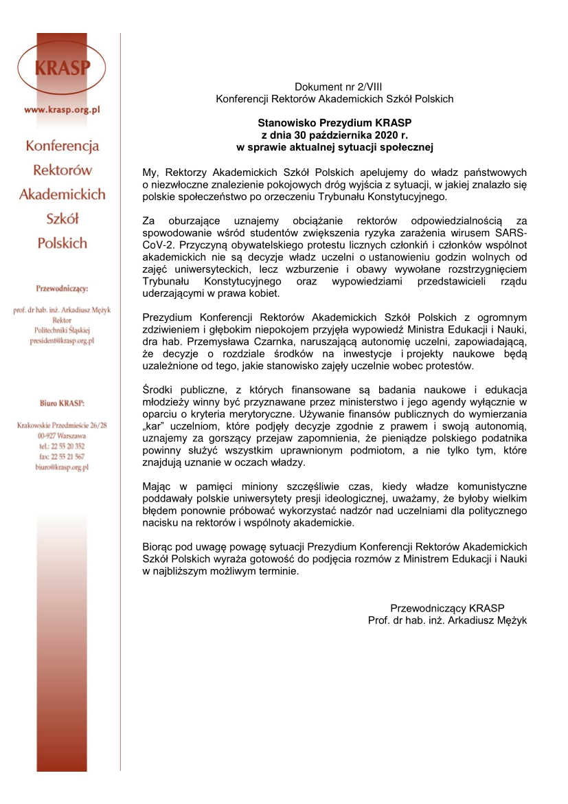 Zachęcamy do zapoznania się z treścią Stanowiska Prezydium KRASP z dn. 30 października 2020 r. w sprawie aktualnej sytuacji społecznej.