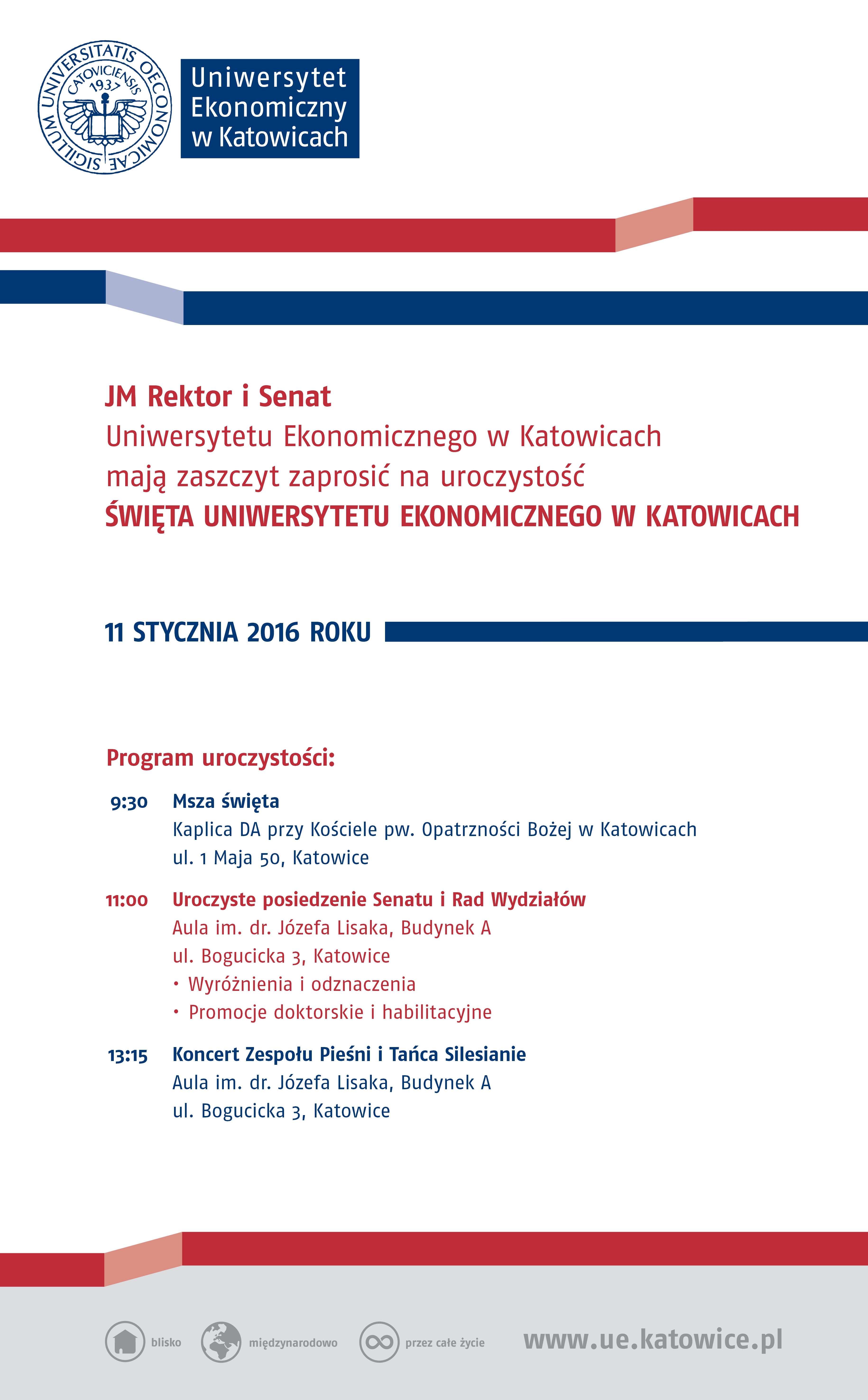JM Rektor i Senat Uniwersytetu Ekonomicznego w Katowicach mają zaszczyt zaprosić na uroczystość Święta Uniwersytetu Ekonomicznego w Katowicach w dniu 11 stycznia 2016 r.